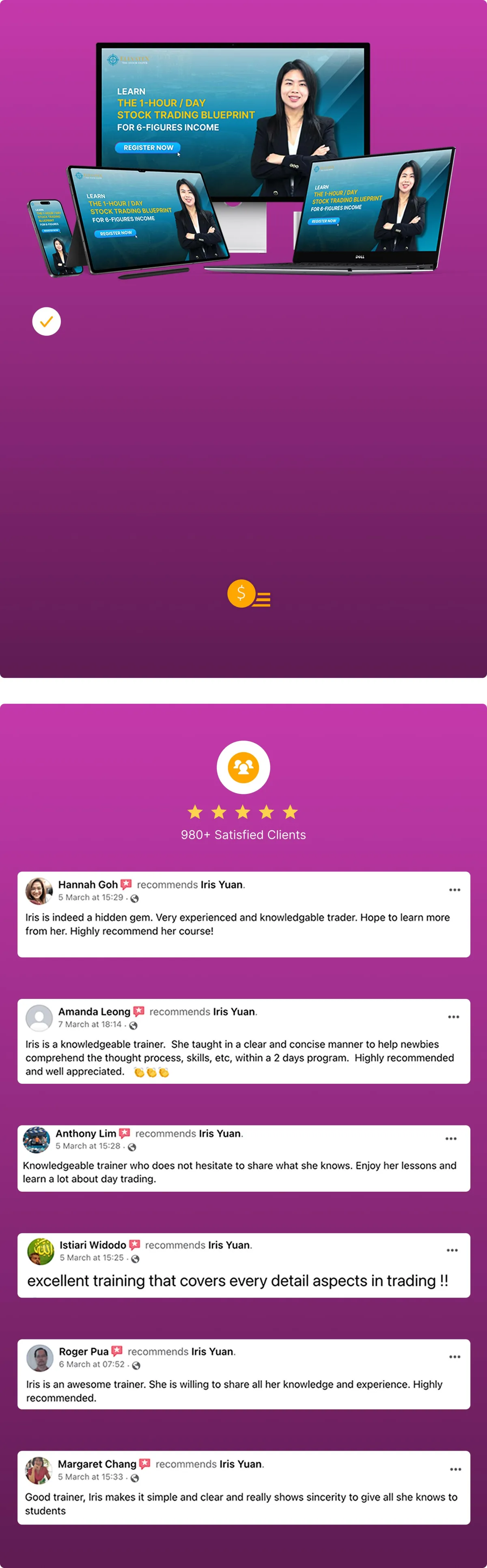 We make no representations, warranties or guarantees whether expressed or implied, made to the content in the program is accurate, complete or up-to-date. Past performance is not indicative nor a guarantee of future returns. We are an education company and hence is not regulated or licensed by MAS as we do not provide investment services.